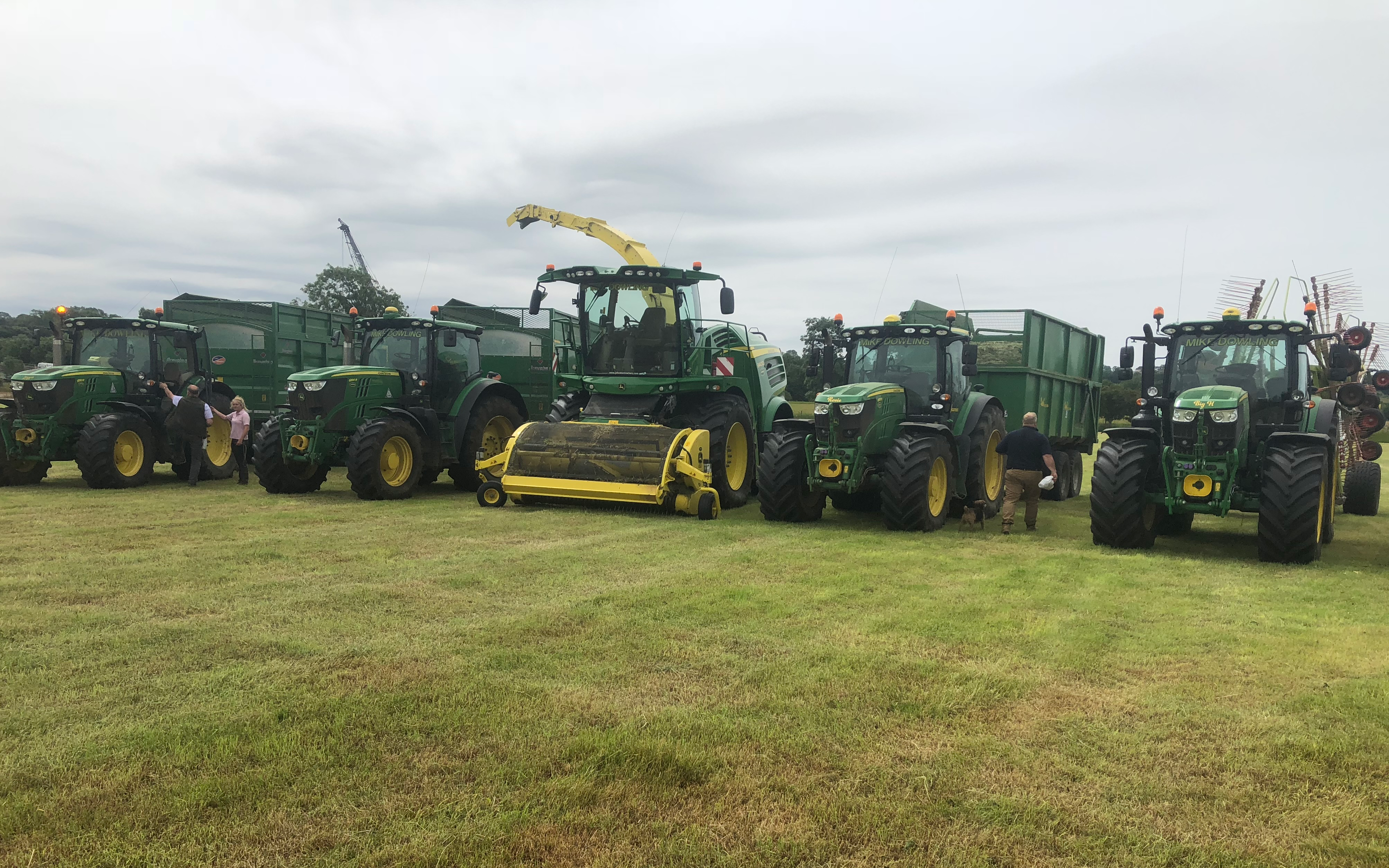 Running a new 8400 John Deere forager traded in this year from a previous 8400. We are running a 48 knife drum cutting down to 2 mm consistent chop. And running a fleet of broughan and aw trailers ranging from 12-16 tonne trailers. And having two buckrakes available. And a 2 rotor and 4 rotor rake new last season.