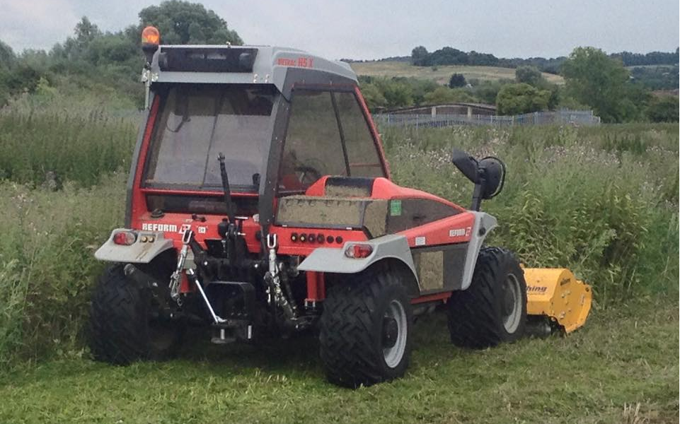 We offer mowing with our light weight Reform tractor. It has a wide working range for the size and can tackle slopes with ease.