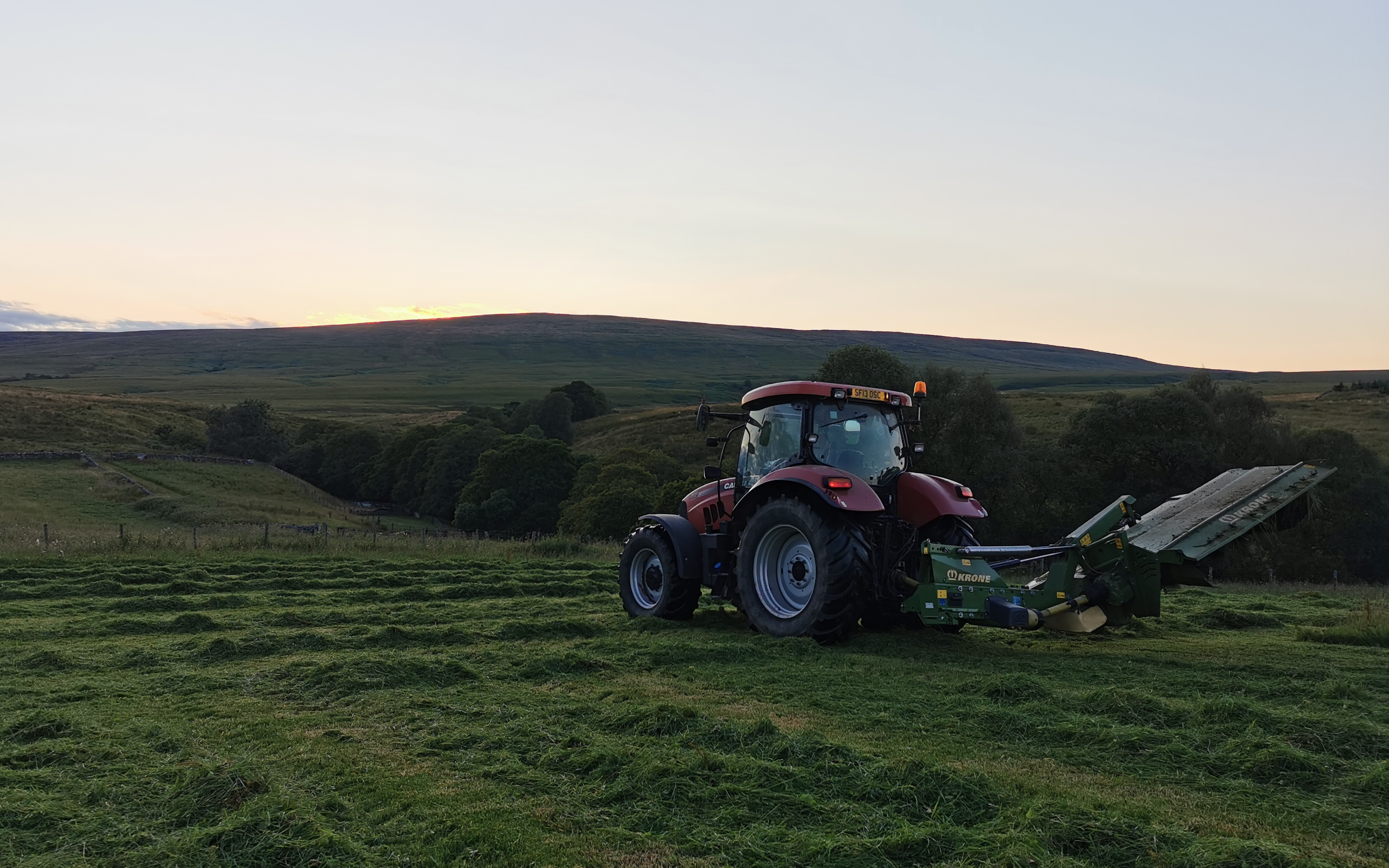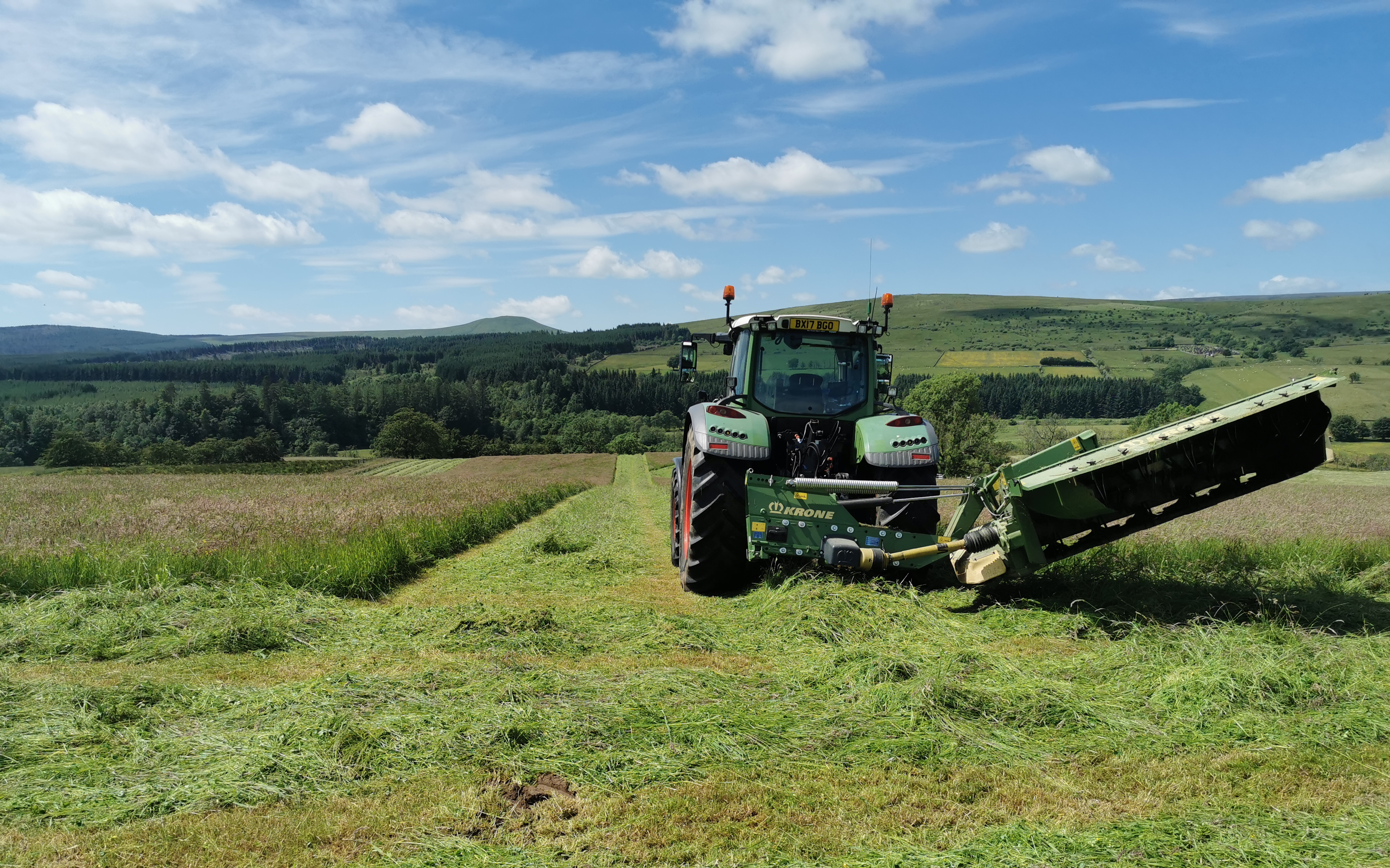 Mowing for silage and hay with our Krone R320CV, the mower makes a great job even in a crop that has gone flat. We can adjust the conditioner to your requirements. It is a gear driven conditioner so will not slip in a heavy crop. Mowed using GPS to keep the rows straight and acreage correct. Damage from debris is chargeable. All of our machines are owner operated and maintained as such. We can offer the full service from mowing, tedding, raking, baling, wrapping and stacking.