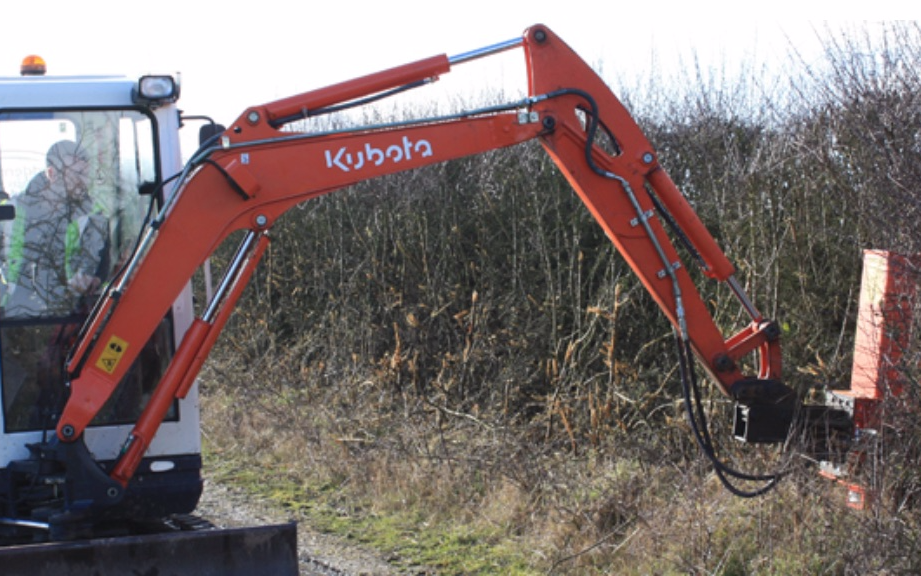 Attached to an excavator with a reach of five meters, we can get in to areas, where tractor mounted hedge cutters cannot reach.