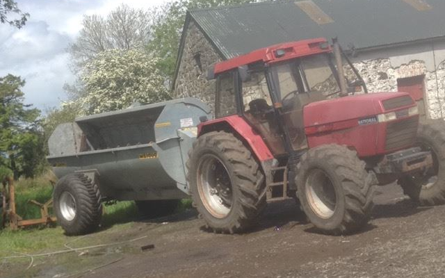 Our manure spreader throws from the side covering 9.5 cubic yards.