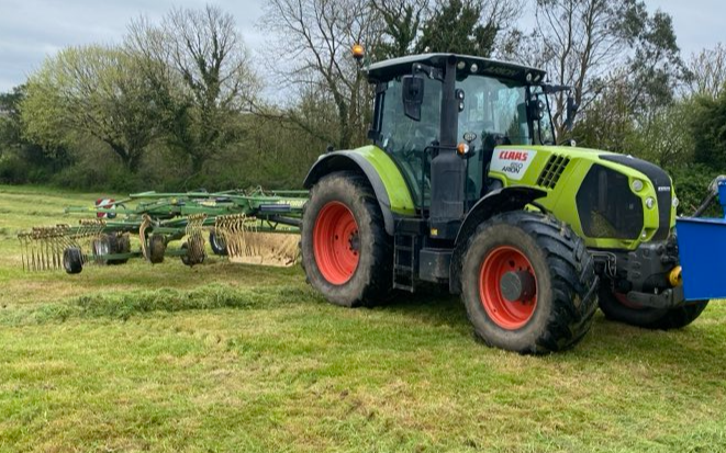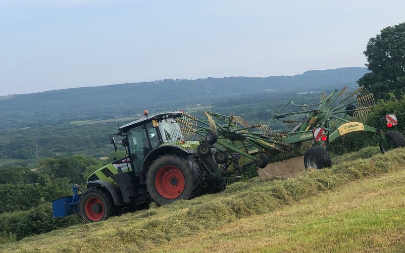 Raking using Krone TC760 twin rotor rake that leaves the perfect row for a baler or forage wagon. Travel may be charged at our standard rate depending on job size and distance from base Price per acre may vary depending on the job.
