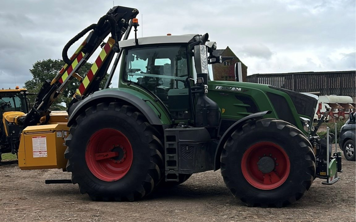 the hedge cutter is fitted with F14 on a 5ft flail head, VFR and telescopic reach. Hi viz décor with flashing lights at 1m spacings to cover highways operations. mounted to our Fendt 828 for stability that runs on vario grip to reduce compaction during wet weather cutting. Operator has been cutting hedges for over 10years and can undertake one off cuts to whole farm contracts.