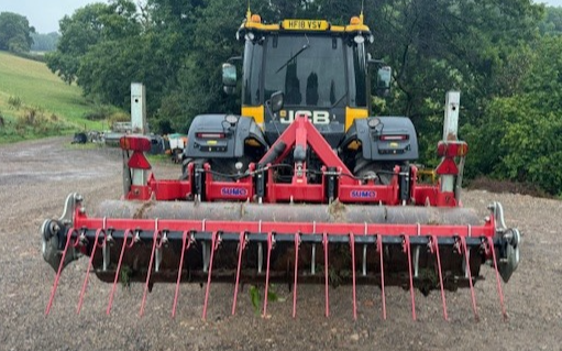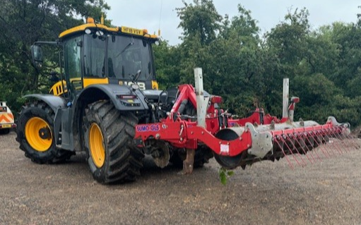 This Grassland subsoiler has low disturbance auto reset legs that can be adjusted in depth to break both cow pans and tractor pans. front leading discs to cut sward to prevent grass disturbance. Rear spiked roller packer to push top ground down and pierce the soil. rear tines to rake dead grass from sward as would a pass with a chain harrow. This system would aid drainage on permanent pasture and increase yields per acre as it allows water to drain freely through heavily panned ground and helping roots to grow freely.