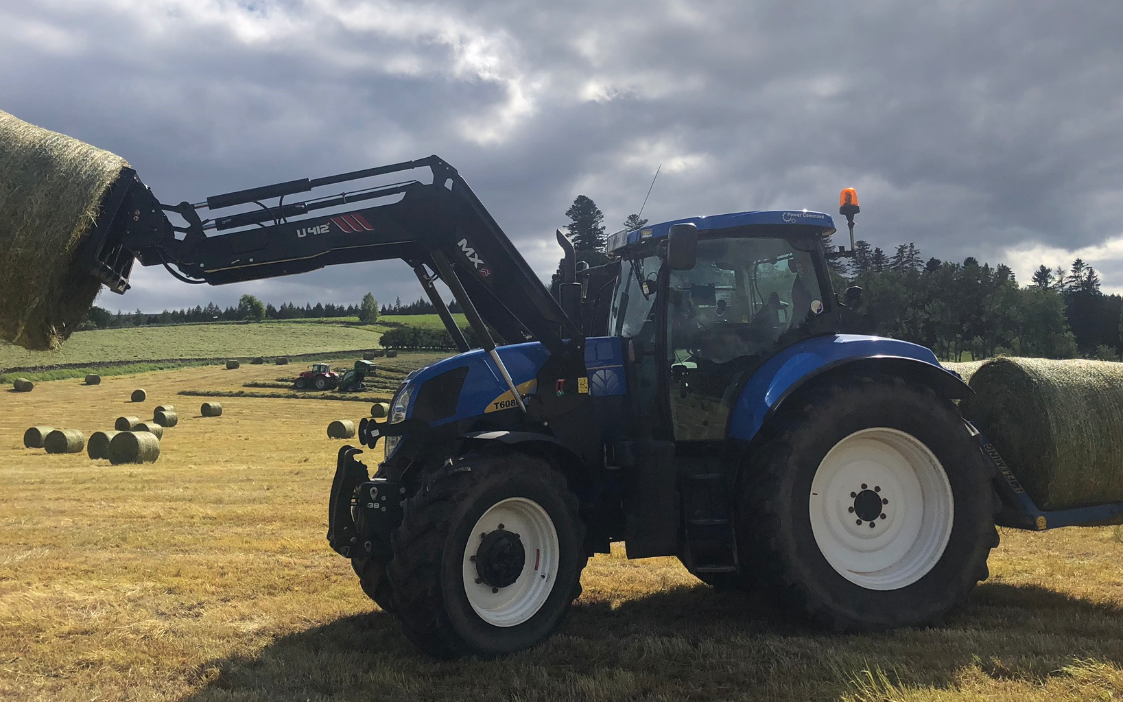 Tractor and driver with front linkage and loader. Available for silage handling, firewood processing, concrete crushing and haulage.
