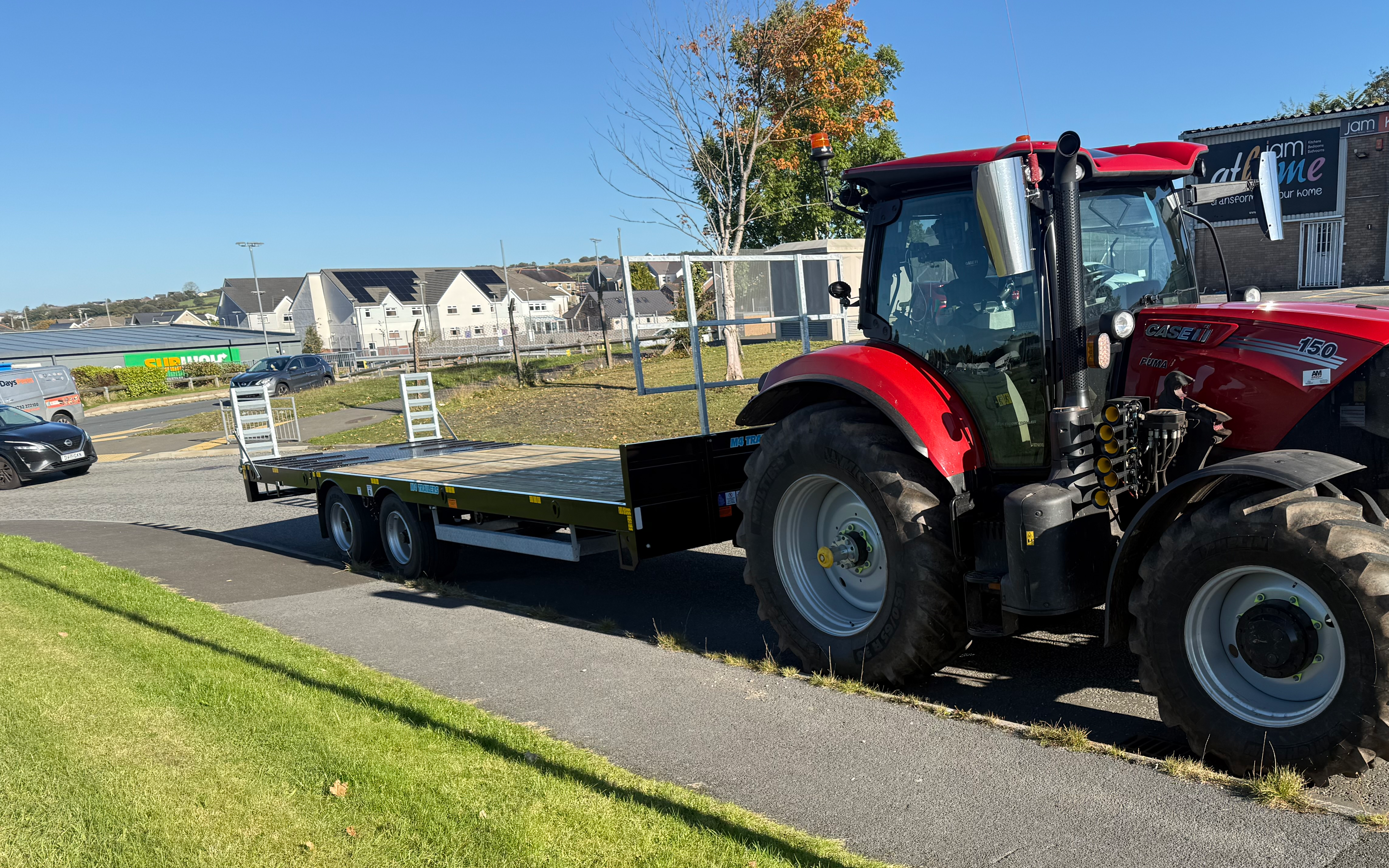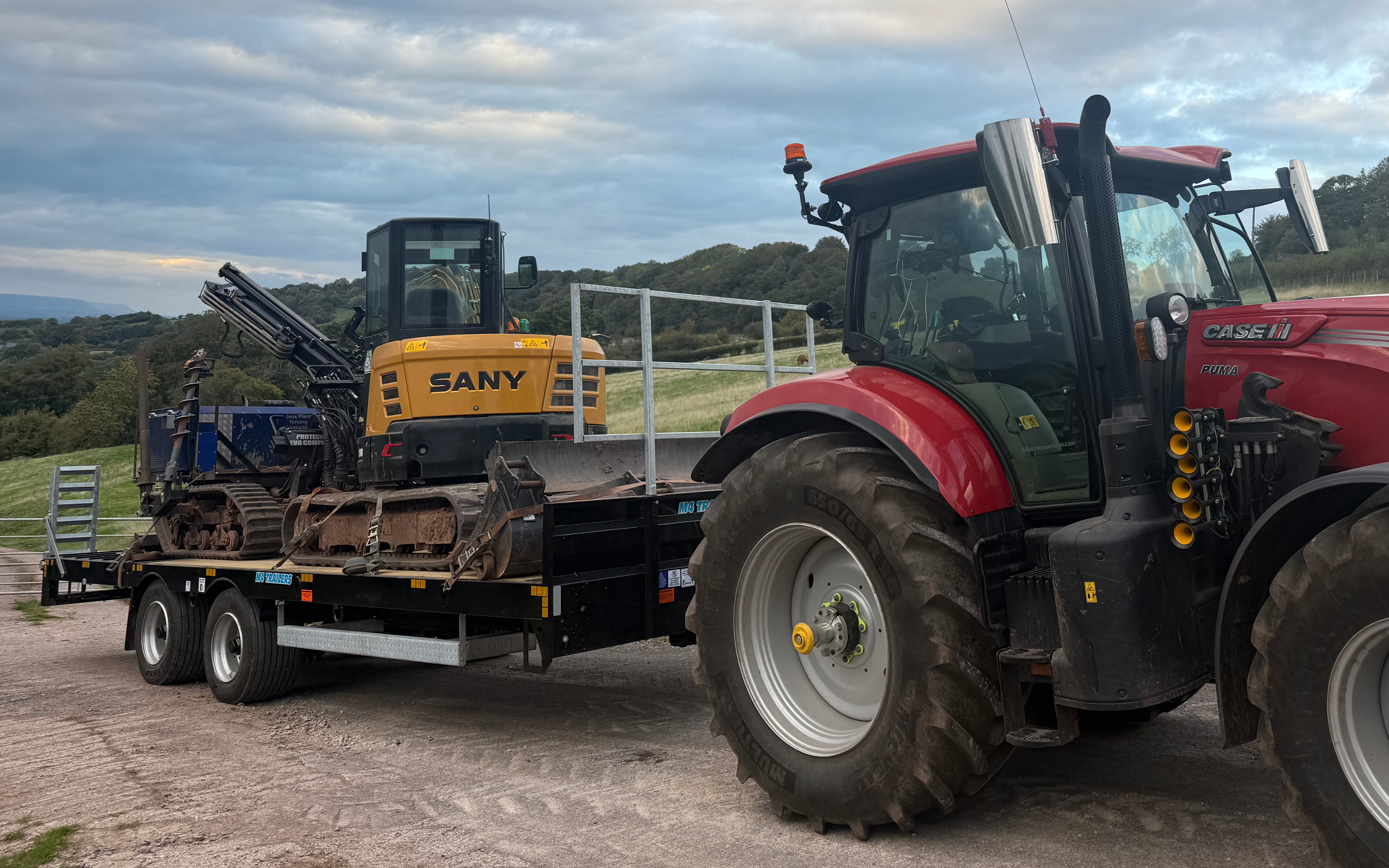Low loader available to hire with tractor and driver to move machines and materials or bales around it has a 26ft bed to help carry materials